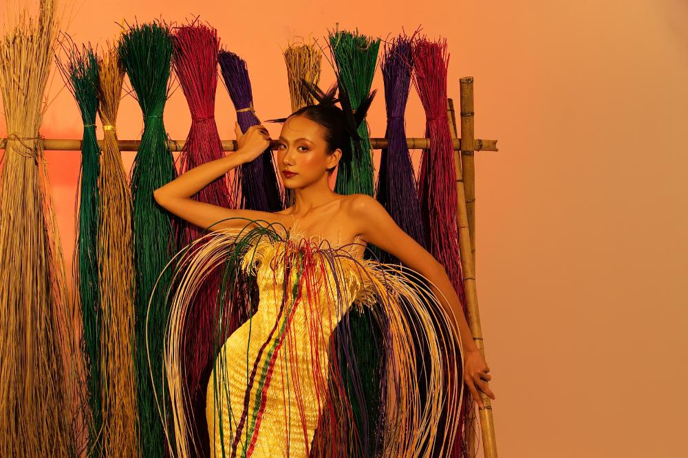 Không chỉ dừng lại ở thiết kế, Bùi Hoàng Ân còn đầu tư đáng kể cho phần hình ảnh. Bộ ảnh lookbook được xây dựng như một câu chuyện hoàn chỉnh, thay vì chỉ là những khuôn hình nhằm phô diễn trang phục. Hơn 20 chiếc chiếu cùng hàng trăm sợi cói được mua trực tiếp từ làng Định Yên và được đặt để tinh tế giúp xây dựng bối cảnh trở nên sống động.