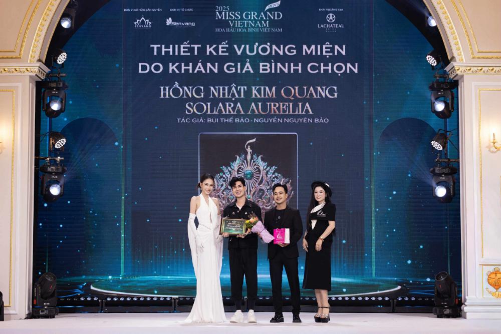 Vương miện Miss Grand Vietnam 2025 mang tên “Hồng nhật kim quang” do hai nhà thiết kế trẻ Bùi Thế Bảo và Nguyễn Nguyên Bảo thực hiện.