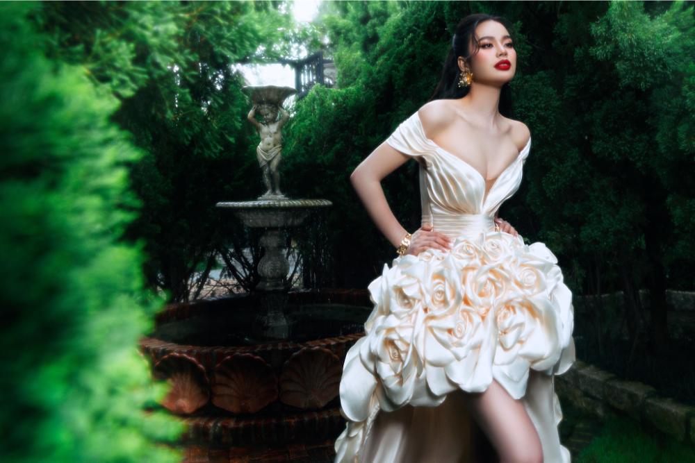 Trong bộ hình lần này, Á hậu Ánh Vương đã tin tưởng lựa chọn trang phục của NTK Brian Võ. Lấy cảm hứng từ vẻ đẹp quyến rũ, kiêu sa của nàng hậu, nhà thiết kế đã dành cho cô chiếc vây mullet đầy lộng lẫy với hàng chục bông hồng 3D khổ lớn, được may thành tà dài phía sau. Đôi chân dài cùng vòng một gợi cảm của người đẹp cũng được khai thác triệt để trong thiết kế này.