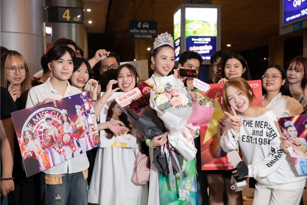 Nhiều người hâm mộ cũng có mặt ở sân bay, hô vang tên Á hậu Đỗ Hà Trang với niềm tự hào. Trước tình cảm to lớn này, Đỗ Hà Trang không giấu được sự xúc động. Cô liên tục nói cảm ơn và chụp ảnh, ký tặng cùng fan.