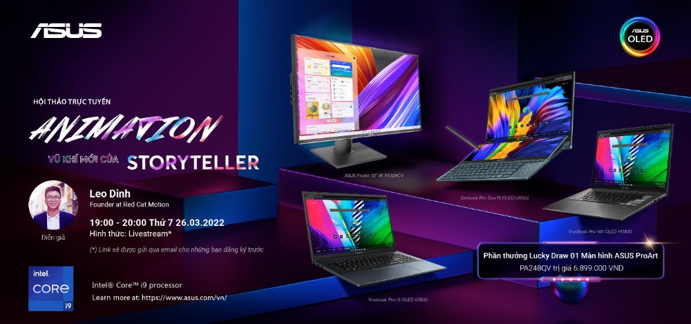 ASUS Việt Nam tổ chức Hội thảo online mang tên “Hội nhập làm quảng cáo bằng Animation” vào thứ 7 ngày 26/3/2022 với hình thức livestream trên trang Facebook chính thức của ASUS, các fanpage lớn trong cộng đồng sáng tạo như Vietnam Halography, RGB cùng fanpage các đại lý đối tác.