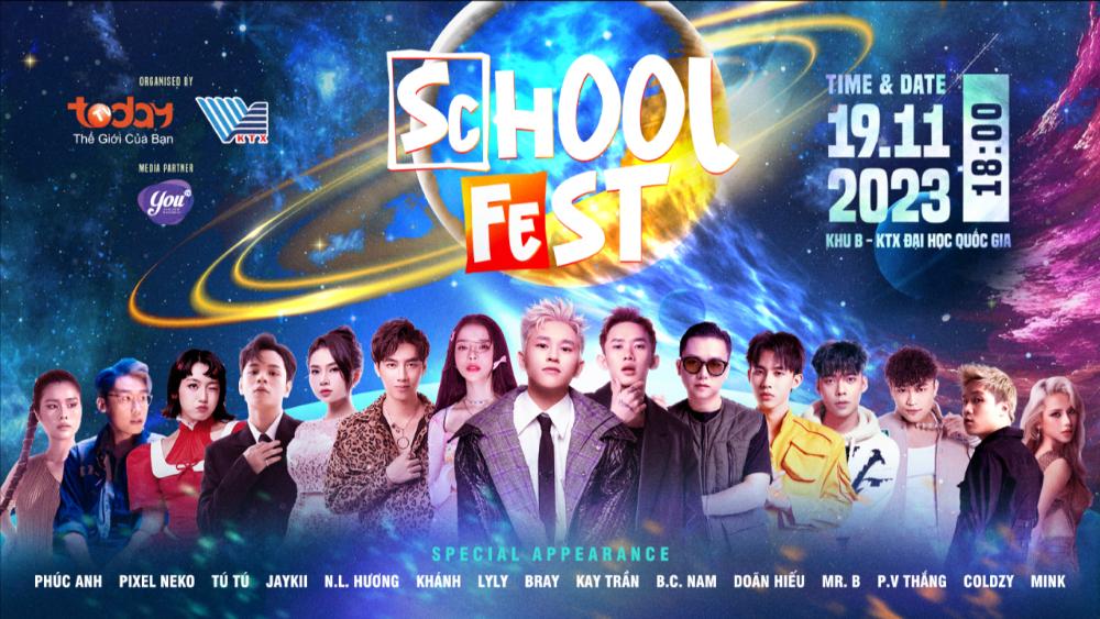 School Fest – Lễ hội âm nhạc thường niên do Kênh truyền hình TodayTV phối hợp cùng Ký túc xá Đại học Quốc gia TP.HCM tổ chức, ghi dấu ấn sâu sắc trong lòng cộng động sinh viên và giới trẻ Sài thành qua 3 mùa hội diễn ra siêu hoành tráng. Trở lại với mùa thứ 4, School Fest khiến người hâm mộ không khỏi trầm trồ khi công bố dàn nghệ sĩ hùng hậu, toàn những gương mặt đình đám, ‘chất chơi’ như: B Ray, LyLy, Kay Trần, Bùi Công Nam, DJ KHÁNH, Ngô Lan Hương, Jaykii, Coldzy, Mr.B, Doãn Hiếu, tú tú, MINK, Phúc Anh, Phạm Việt Thắng, Pixel Neko.