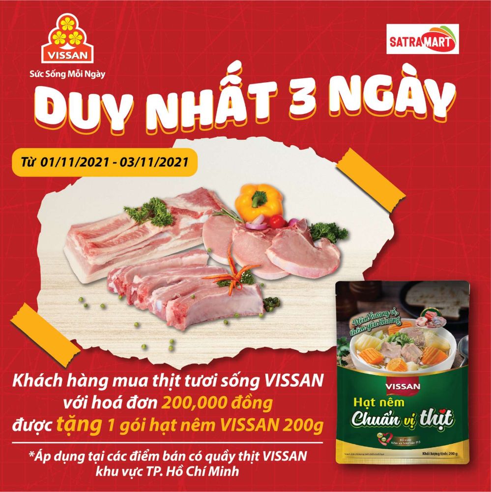 Theo đó, khách hàng khi mua đơn hàng Thịt tươi sống VISSAN với giá trị từ 200,000 đồng trở lên sẽ được tặng 1 gói Hạt Nêm Chuẩn vị thịt VISSAN 200g.