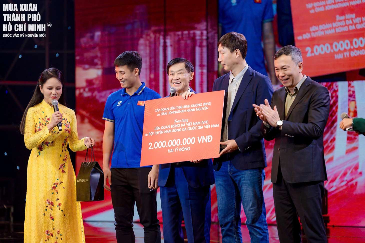 Là người luôn dõi theo và dành tình cảm đặc biệt cho đội tuyển bóng đá nam Việt Nam, ông Johnathan Hạnh Nguyễn đã tặng số tiền 2 tỷ đồng cho Liên đoàn bóng đá Việt Nam và Đội tuyển ngay tại sân khấu để mừng chiến thắng với ngôi vị vô địch AFF Cup, đồng thời chăm sóc cho những cầu thủ bị chấn thương trong quá trình thi đấu.