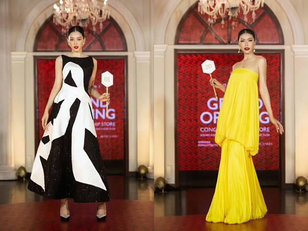 Giữa không gian cổ điển đầy duy mĩ của khách sạn Continental, Tiểu Vy mở màn show diễn với một thiết kế đặc biệt với kỹ thuật phức tạp và cầu kì. Trên nền chất liệu ren sequin xếp li, những nghệ nhân nhà CONG TRI đã sử dụng kĩ thuật patchwork xếp nhiều lớp vải tạo nên bề mặt chất liệu mới, kết hợp kĩ thuật đính đá Swarovski và thiết kế rập đa chiều để dựng phom. Bên cạnh sự đính kết cầu kì thì chiếc nơ trắng to bản chất liệu satin xếp li cũng là một điểm nhấn gây ấn tượng thị giác. Được biết, các nghệ nhân đã dành ra 200 giờ đồng hồ để đính kết công phu và xếp lớp để tạo nên thiết kế đặc biệt này.