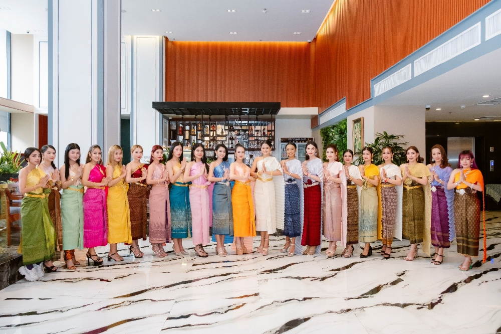 Các thí sinh trong trang phục truyền thống của Campuchia tham gia một số hoạt động tập thể