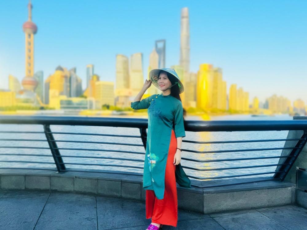 Với trang phục áo dài Mẹ Thiên Nhiên cùng nón lá được thiết kế riêng Trúc Thy đã ngẫu hứng tạo dáng ngay Bến Thượng Hải – một địa điểm nổi tiếng trong bối cảnh phim cùng tên từ nhiều thập niên trước.