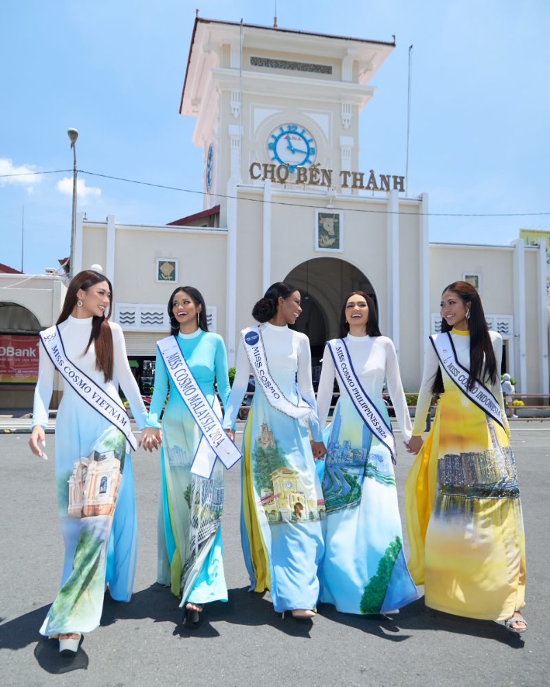 Các thí sinh của Miss Cosmo 2024 hào hứng khi lần đầu được diện trang phục truyền thống Việt Nam và ghé thăm Chợ Bến Thành – địa điểm tham quan biểu tượng của Thành phố Hồ Chí Minh. Ketut Permata Juliastrid Sari, Ma. Ahtisa Manalo, Saranya, Mbali Dlamini cùng Xuân Hạnh khoe vẻ đẹp duyên dáng, xinh đẹp trong tà áo dài đến từ NTK Trung Đinh.