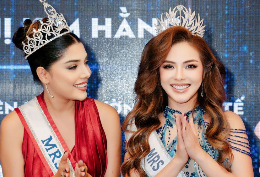 Đương kim Mrs World 2022 Sargam Koushal và Vương Kim Hằng- Đại diện Việt Nam tham dự Mrs World 2023