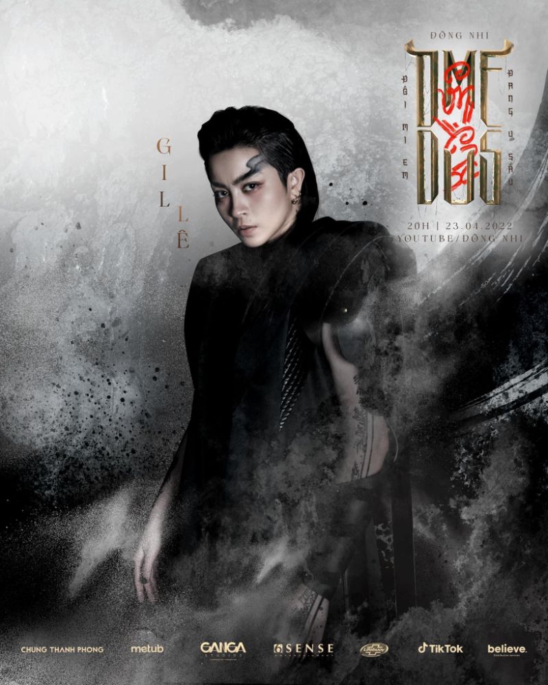 Trong poster giới thiệu, Gil Lê diện nguyên bộ đồ đen, để tóc dài đậm chất cổ trang, đôi tay xăm những ký tự lạ, thần thái chất ngầu và khá sắc lạnh. Cũng như những poster của dàn khách mời được công bố trước đó, poster Gil Lê mang màu sắc bí ẩn, ma mị khó đoán.