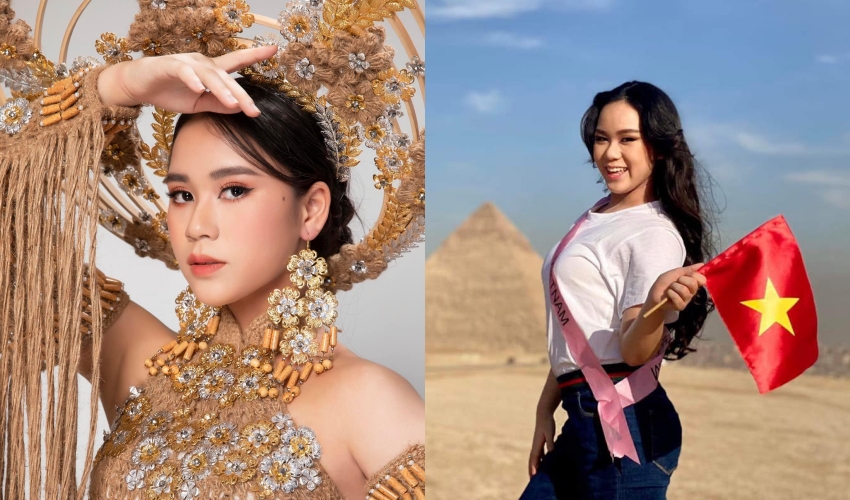 Hoa hậu Bella Vũ tự hào dương cao ngọn cờ Việt Nam tại buổi chụp ảnh ở Kim Tự Tháp.