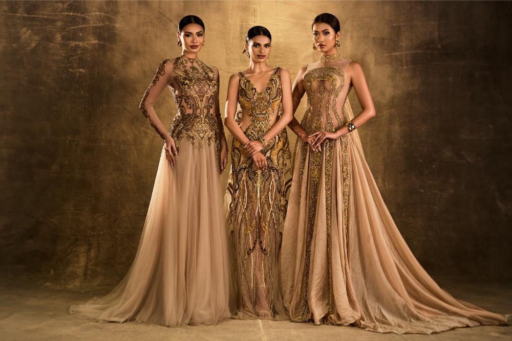 Đương kim Hoa Hậu Hoàn Vũ Quốc Tế – Ketut Permata Juliastrid vô cùng lộng lẫy trong một thiết kế thuộc BST Golden Heritage, chiếc đầm xuyên thấu ánh kim mờ ảo, vừa huyền bí vừa sang trọng. Á Hậu Hoàn Vũ Quốc Tế 2024 – Mook Karnruethai Tassabut khoe trọn vóc dáng trong chiếc đầm đuôi cá ánh vàng, nổi bật với họa tiết lấy cảm hứng từ kỹ thuật điêu khắc Champa, mang đến vẻ đẹp sang trọng, uy quyền mà vẫn dịu dàng. Đương kim Miss Cosmo India – Vipra Mehta lại thu hút bởi vẻ đẹp ngọt ngào, đậm chất điện ảnh Bollywood, toát lên sự tự tin và năng lượng tích cực của một biểu tượng nhan sắc thế hệ mới của Ấn Độ.