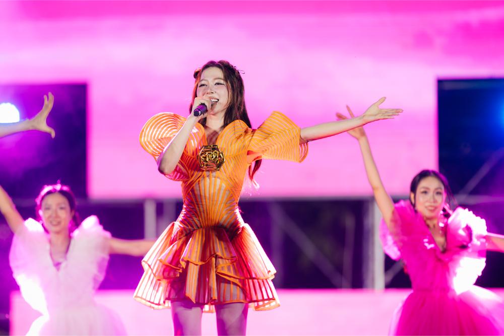 Tại sân khấu gần 7000 khán giả, Hoa hậu Kiều Duy chọn trang phục cam với thân xòe nổi bật, trình diễn bản hit “Đi giữa trời rực rỡ” (Sáng tác: Ngô Lan Hương).