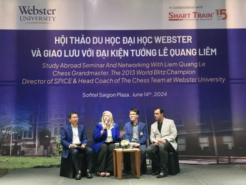 Ngày 14/6/2024, tại Khách sạn Sofitel Saigon Plaza, TP.HCM, Đại học Webster phối hợp cùng Học viện Smart Train đã tổ chức thành công: Hội thảo học bổng du học đại học Webster và giao lưu với đại kiện tướng Lê Quang Liêm – Vô địch thế giới nội dung cờ chớp 2013, Giám đốc SPICE & HLV trưởng đội tuyển cờ vua tại Đại học Webster.