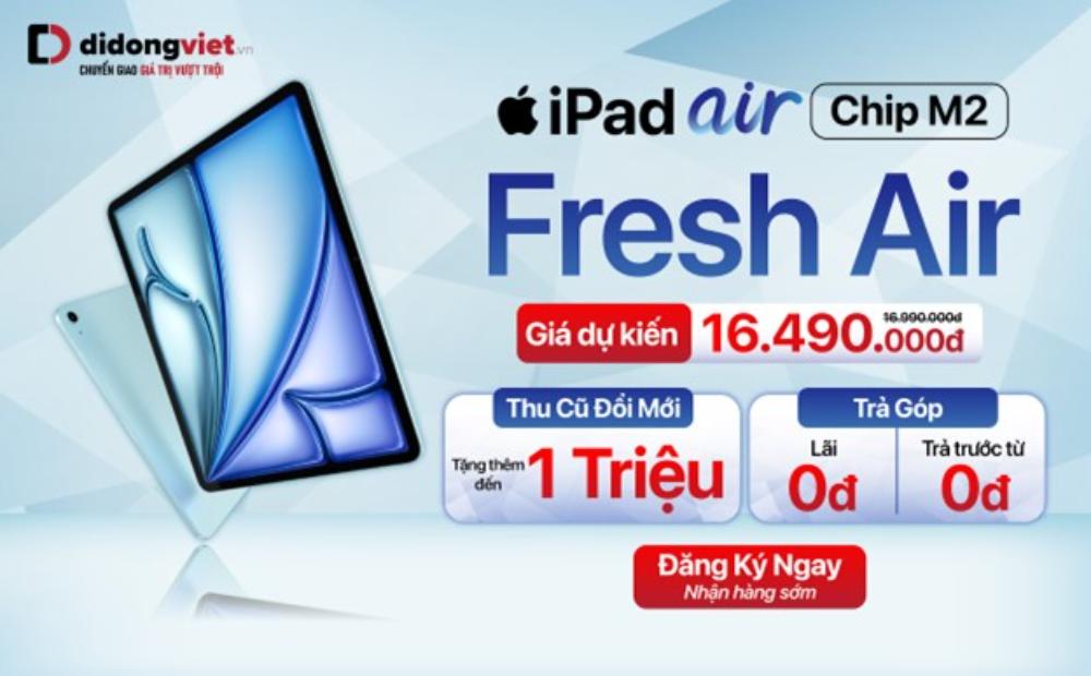 Theo đó, Di Động Việt dự kiến giá bán iPad Air 11inch phiên bản 128GB, 256GB, 512GB, 1TB với giá lần lượt là 16,49 triệu đồng; 18,99 triệu đồng; 24,49 triệu đồng và 29,99 triệu đồng. Phiên bản iPad Air 13inch sẽ có giá từ 21,99 triệu đồng với phiên bản 128GB, phiên bản 256GB giá từ 24,49 triệu đồng; bản 512GB giá từ 29,99 triệu đồng và bản 1TB giá từ 35,49 triệu đồng.