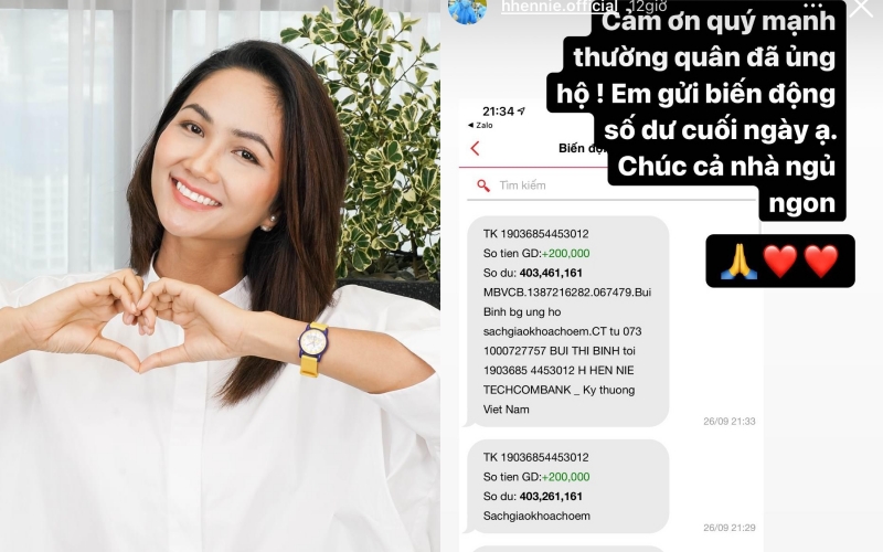 Để đáp lại sự tin tưởng từ mọi người, hành động đầu tiên của H’hen Niê chính là chụp lại tin nhắn biến động số dư trong tài khoản mỗi ngày và đăng công khai lên mạng xã hội. Đều đặn, nàng hậu sinh năm 1992 đã chụp lại biến động số dư vào cuối ngày cũng như số dư vào sáng hôm sau. Qua đó, mọi người có thể dễ dàng theo dõi số tiền tài khoản cô nhận được trong thời gian kêu gọi từ thiện.