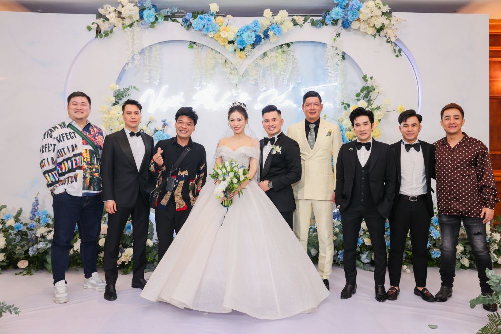 Trong dàn phù rể gây bất ngờ khi có ca sĩ Quang Hà và Việt Anh. Trong tiệc cưới, hai nghệ sĩ cũng “giành” luôn vai trò MC, pha trò hài hước khiến gây nhiều tiếng cười, niềm trong ngày vui của bạn thân.