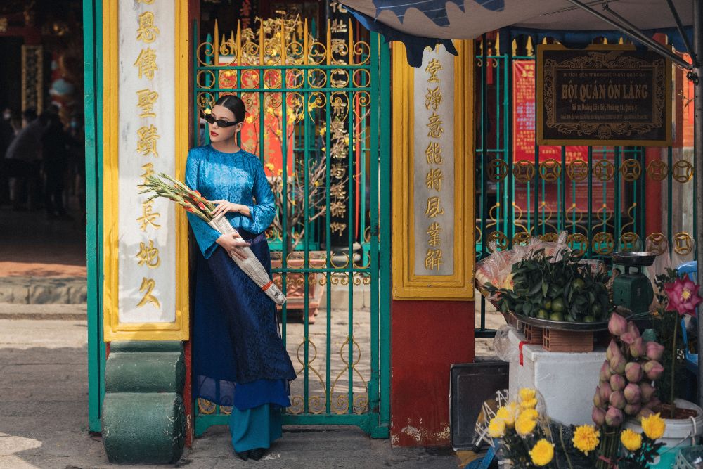 Sử dụng chất liệu gấm kết hợp lụa tơ tằm, những chiếc áo dài bay bổng giữa khu phố người Hoa đầy cổ kính, bình dị. Stylist sử dụng bó hoa huệ được gói giấy cũ để tạo nét hoài cổ về những cô gái thướt tha trên phố xuân.