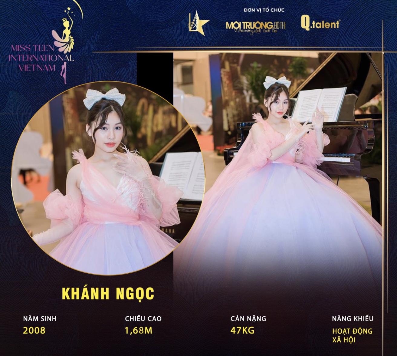 Được biết, thí sinh tài năng sinh năm 2008, chỉ mới 14 tuổi đã sở hưu chiều cao 1m68, ngoại hình chuẩn cùng gương mặt mang nét đẹp riêng. Ngoài năng khiếu là các hoạt động xã hội, Khánh Ngọc còn có thế mạnh ở mảng nghệ thuật. Với kinh nghiệm đứng trước ống kính, lên sàn catwalk từ 8 tuổi, thí sinh 10X có sự tự tin, thần thái và sự thích ứng trong những điều kiện áp lực của cuộc thi nhan sắc…