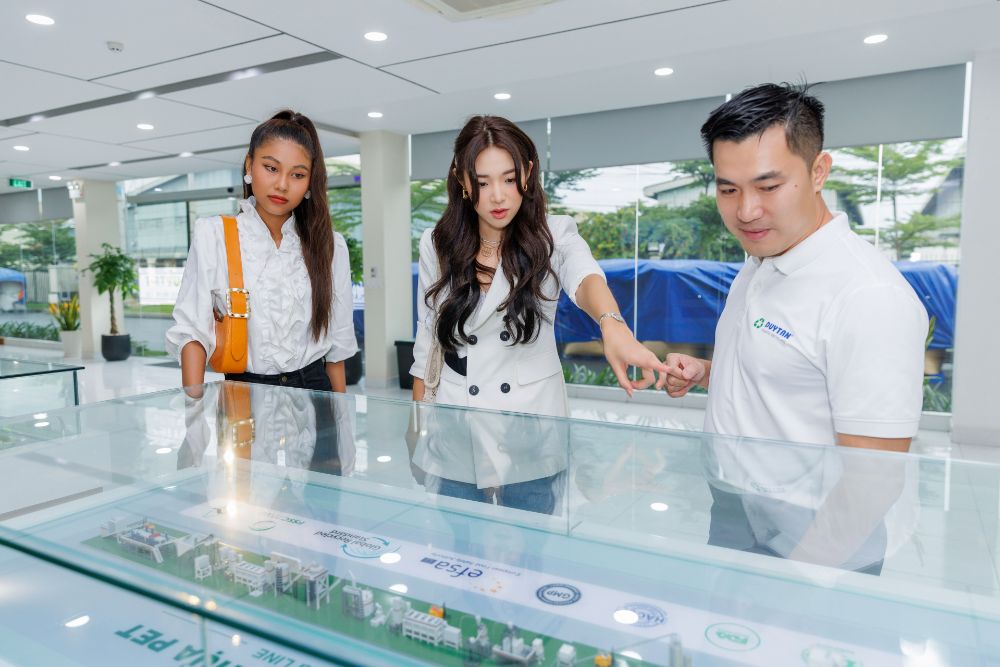 Bên cạnh việc tìm hiểu các thông tin cơ bản về hành trình tái chế rác thải nhựa, Hoa hậu Mina Sue Choi và Thạch Thu Thảo còn trực tiếp vào tham quan nhà máy và xem qua quy trình tái chế các sản phẩm. Nhà máy nơi đây được vận hành theo 3 tiêu chuẩn: Không khí thải – Không nước thải và Không rác thải. Hoa hậu Mina cho biết mình rất bất ngờ khi chứng kiến một hồ cá Koi được nuôi bằng chính nguồn nước thải tại nhà máy. Được biết, nguồn nước thải của nhà máy được tái sử dụng hoàn toàn. 80% lượng nước được quay trở lại quy trình sản xuất và 20% được sử dụng cho chăm sóc cảnh quan và nuôi cá. Đây cũng chính là cách mà Công ty Nhựa Tái Chế DUYTAN chứng minh cam kết về bảo vệ môi trường của đơn vị.