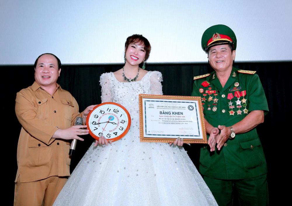 Nsx Phi Thanh Vân nhận quà và bằng khen từ Liên Hiệp Hội UNESCO Việt Nam do Ông Phạm Đình Vương – Giám đốc Trung tâm Unesco Văn hóa và Thông tin Truyền thông – Trưởng đại diện Trung ương Hội Giáo dục chăm sóc sức khoẻ cộng đồng Việt Nam tại TpHCM và Ông Đoàn Lang- hội đồng tư vấn Trung Tâm UNESCO Văn Hoá thông tin truyền thông trao tặng trong buổi lễ ra mắt phim BÍ MẬT GIA TỘC