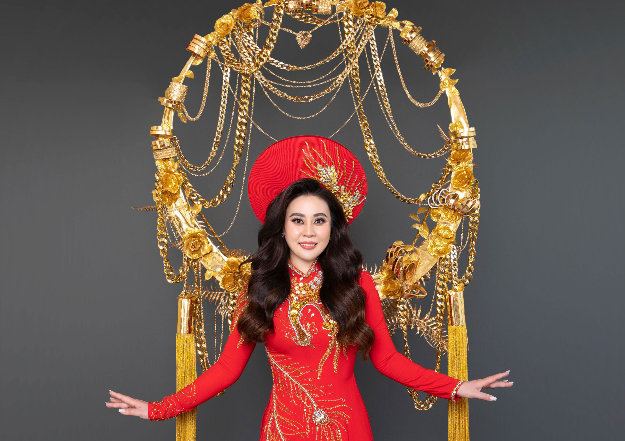 Bộ trang phục của Huỳnh Huấn nổi bật với chiếc áo dài đỏ truyền thống của cô dâu trong ngày cưới, phía sau là phần khung tròn được đính kết, treo rất nhiều vàng- một loại trang sức phổ biến thể hiện sự giàu có, thịnh vượng: “Bộ trang phục mang ý nghĩa tốt lành, hạnh phúc, thu hút tài lộc và sự sung túc. Người Việt nói chung, đặc biệt là người miền Tây luôn mong muốn sự giàu sang, phú quý, ấm no”- Nhà thiết kế chia sẻ.