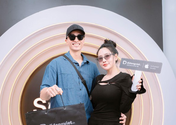 Nữ TikToker và bạn trai check-in với iPhone mới tại cửa hàng Di Động Việt.
