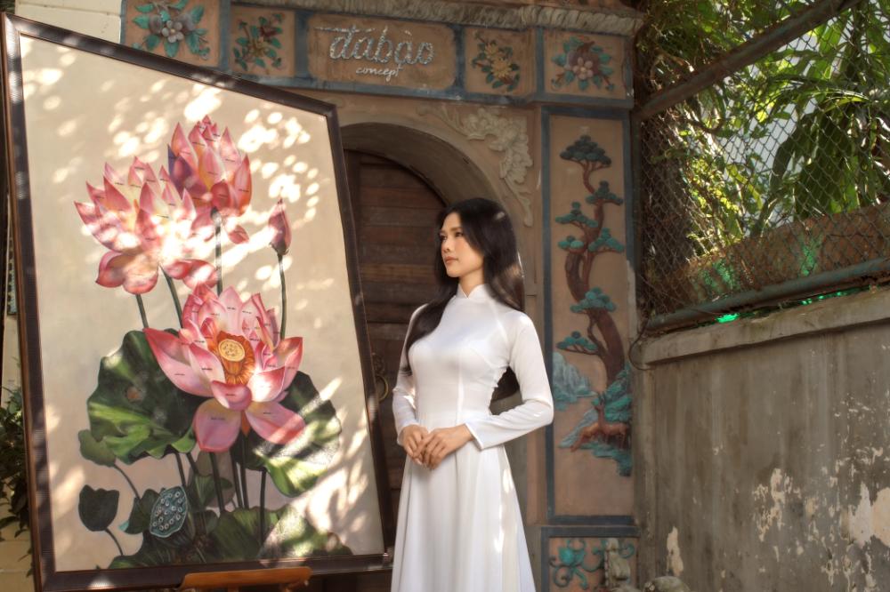 Hoa sen từ lâu đã là biểu tượng của tinh thần Việt Nam, loài hoa cao quý vừa gắn với màu sắc tinh thần tâm linh, vừa là hình ảnh đầy cảm hứng: vươn lên từ bùn đất nhưng vẫn giữ được sự thanh khiết, cao quý và bền bỉ. Trong bức tranh, mỗi cánh sen mang một màu sắc riêng, tượng trưng cho bản sắc văn hóa, ngôn ngữ, phong tục và đời sống của từng dân tộc. Khi đứng cạnh tác phẩm trong tà áo dài trắng, Phúc Anh như trở thành điểm giao thoa giữa hành trình cá nhân và hành trình cộng đồng.
