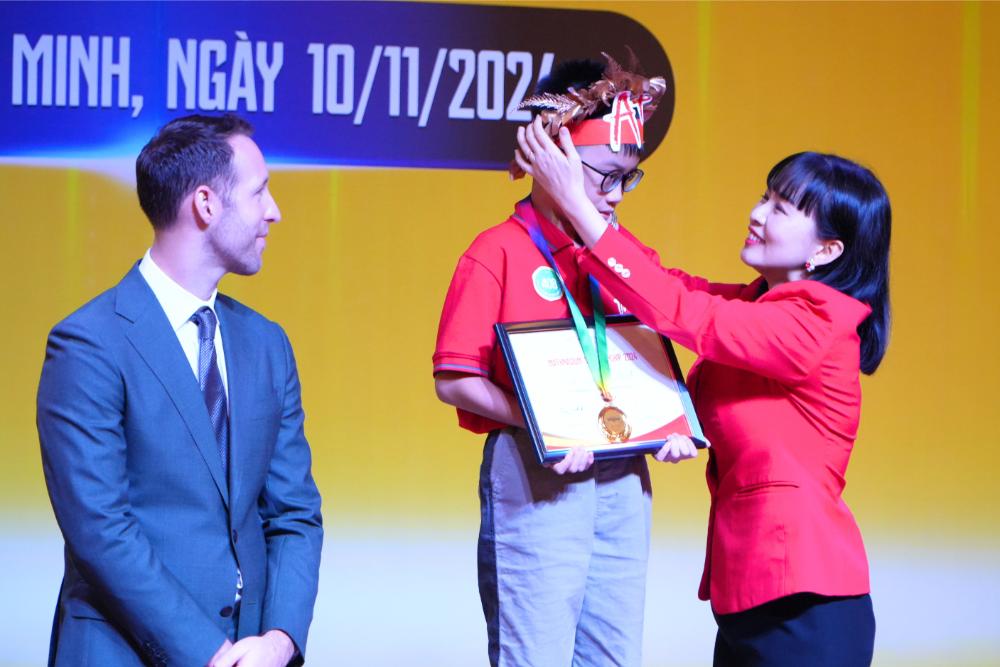Bà Nguyễn Thanh Hoàng Diễm – Tổng Giám Đốc Mathnasium Việt Nam trao vòng nguyệt quế cho thí sinh đoạt giải nhất
