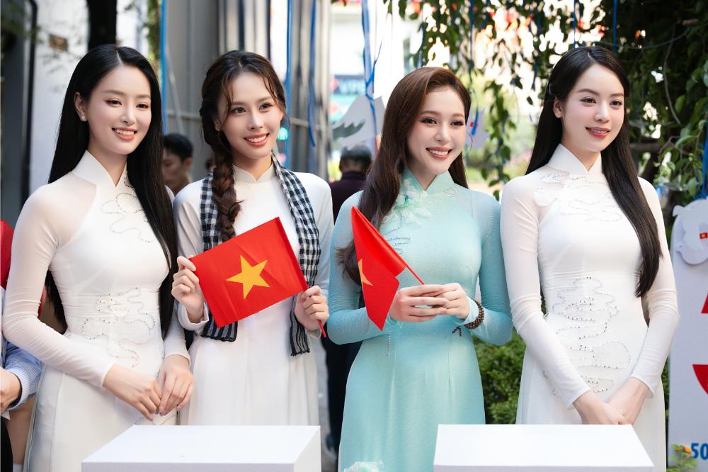 Các nàng hậu khoác trên mình tà áo dài truyền thống, nổi bật tại sự kiện với nhan sắc xinh đẹp, dịu dàng. Bên cạnh đó, Hoa hậu Thanh Thủy, Hoa hậu Kiều Duy, Á hậu Bùi Khánh Linh, Á hậu Ngọc Hằng còn chuẩn bị cờ Việt Nam để gửi tặng đến cho người dân và du khách tại đường sách.