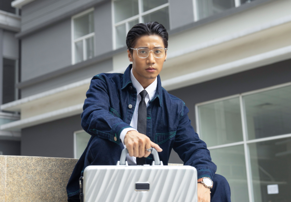 Cùng lấy cảm hứng từ hình tượng điệp viên của Bullet Train, nhưng Tôn Kinh Lâm lại có cách biến hóa khá hay ho. Chất liệu jeans và mắt kính trong suốt mang đến sự trẻ trung, lém lỉnh.