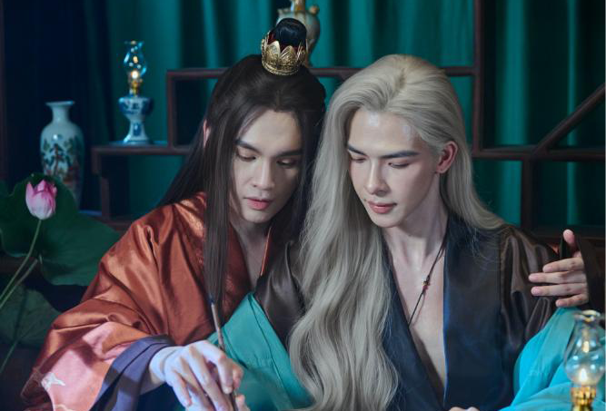 Ở tiền cảnh, Denis Đặng và Nguyễn Trần Trung Quân đứng ở hai thế giới cảm xúc đối lập. Denis, với chiếc quạt đỏ rực trên tay, múa xoay đầy lửa giữa bộ y phục cổ trang cách điệu, như một bóng hình bước ra từ sử thi dân gian. Trái lại, Trung Quân ngồi lặng lẽ phía trên một tấm billboard, đôi mắt trầm tư, tay cầm trang giấy trắng gợi đến hình ảnh một kẻ kể chuyện, một người đã nếm đủ vị đắng của “thất tình”.